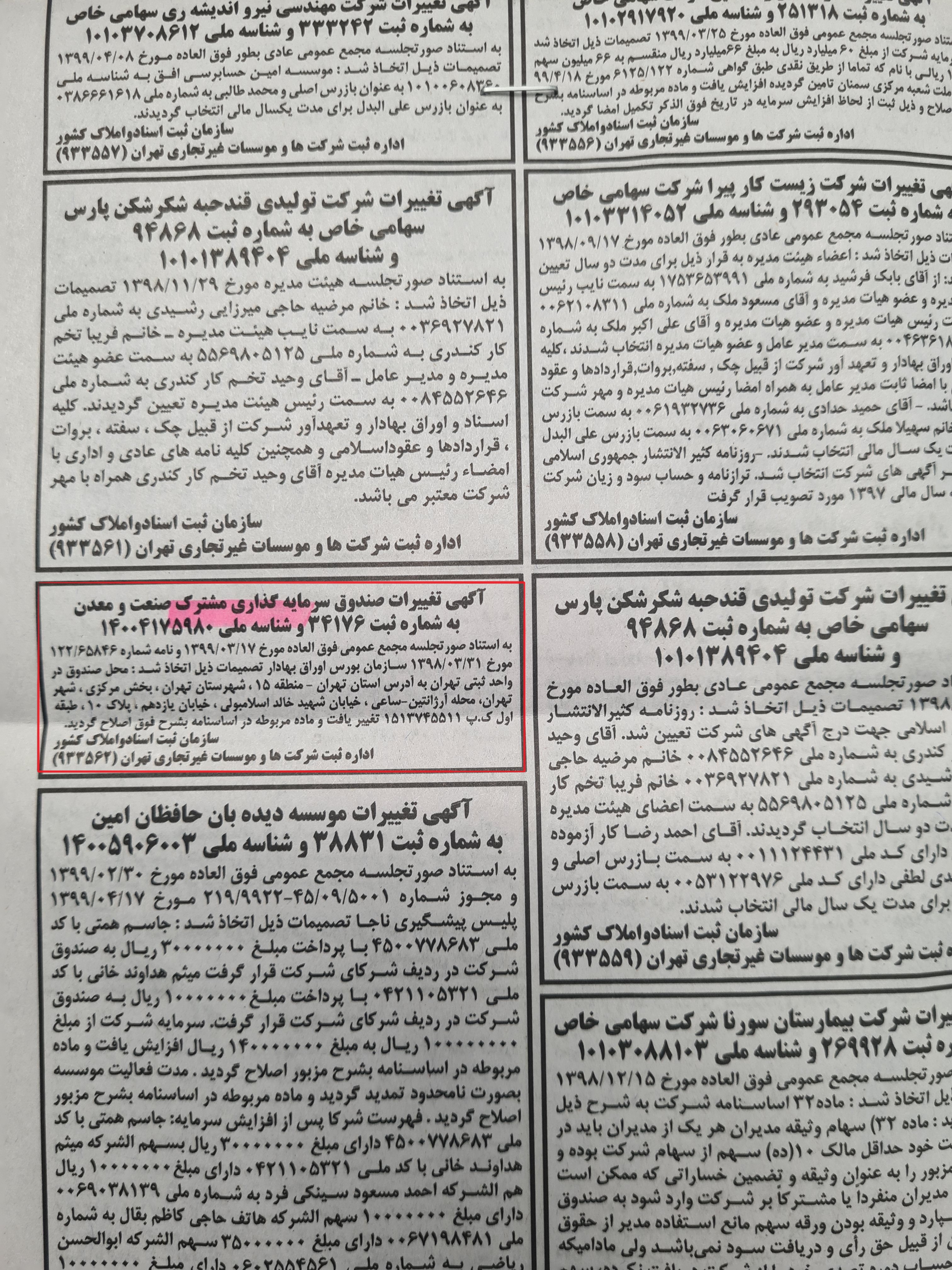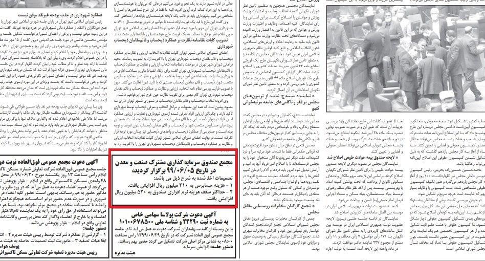 ثبت آگهی تصمیمات مجمع صندوق سرمایه گذاری مشترک صنعت ومعدن مورخ 99/06/05 در روزنامه کثیر الانتشار