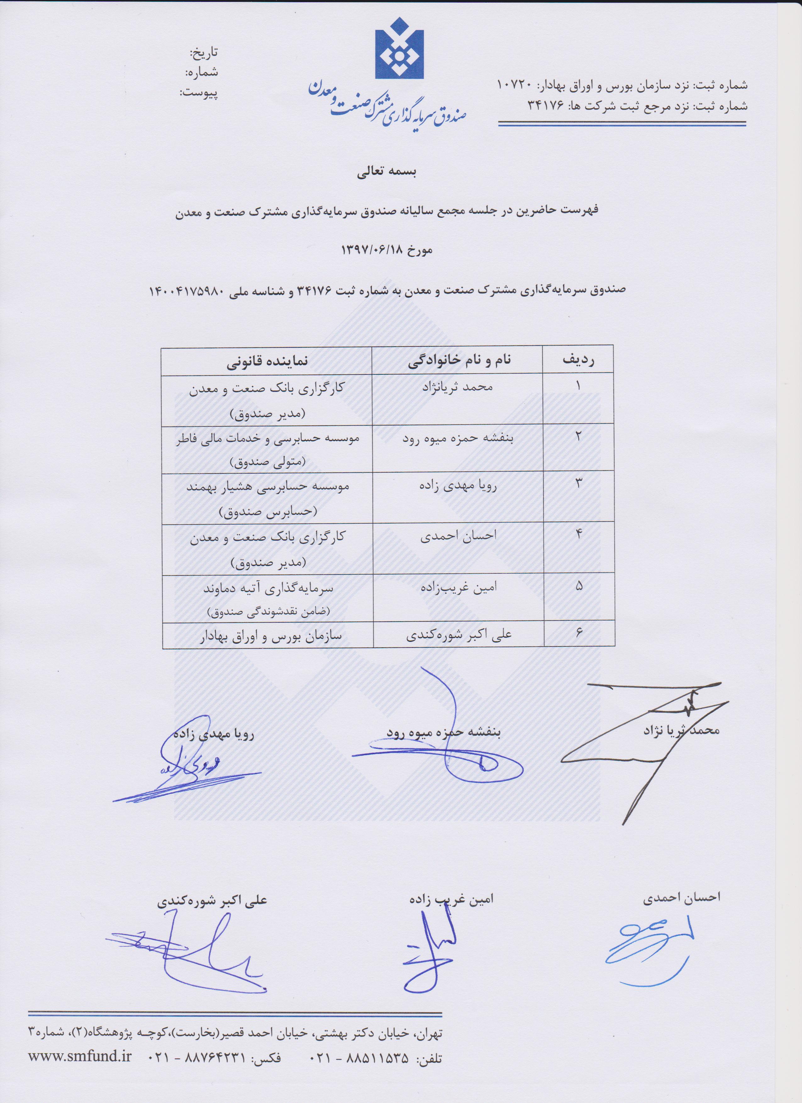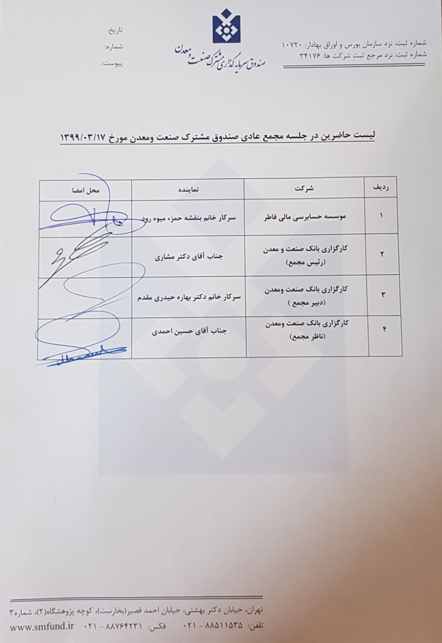 فهرست حاضرین در مجمع صندوق مشترک صنعت و معدن مورخ ۱۳۹۸/۱۰/۱۱