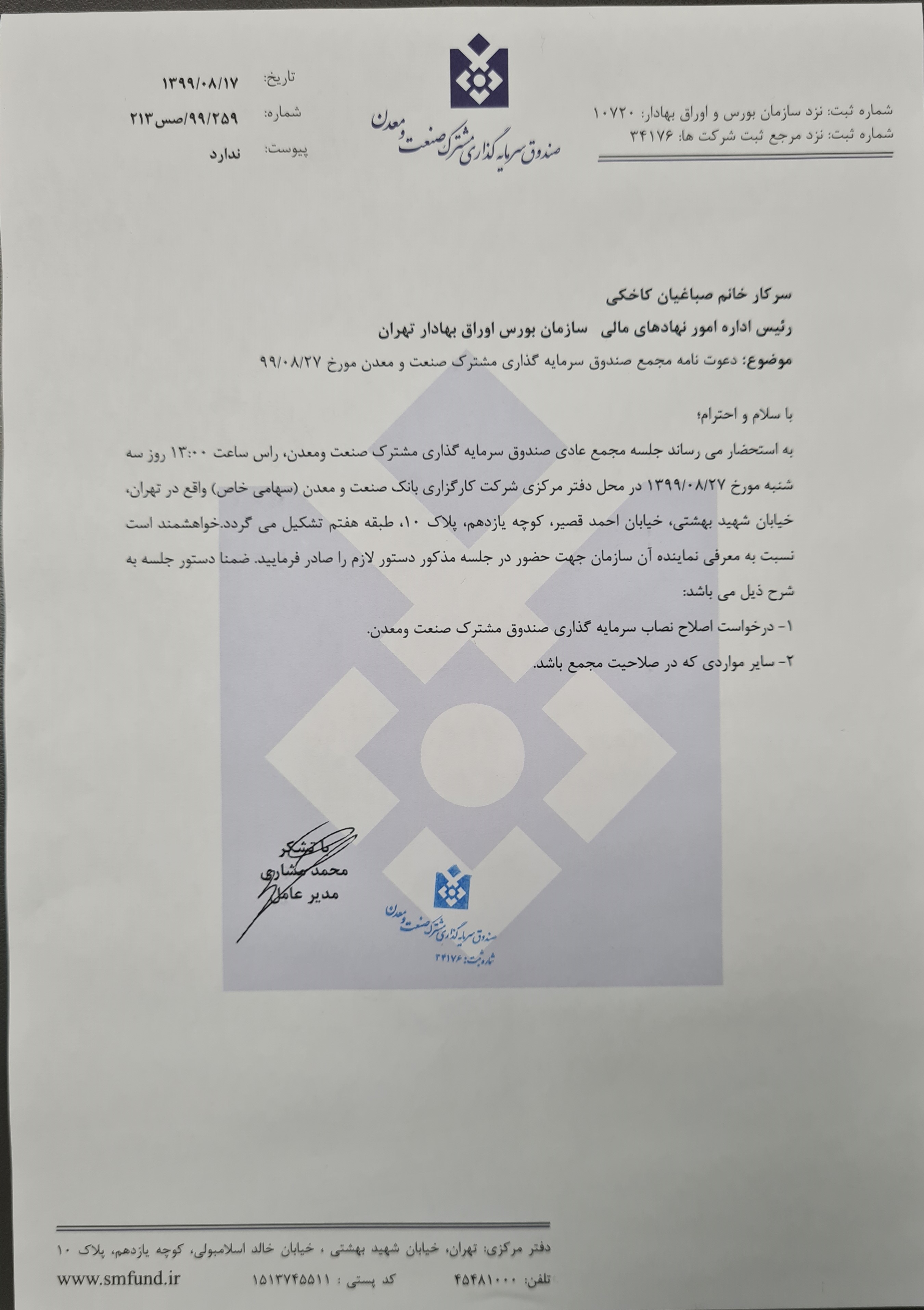 دعوتنامه حضور در مجمع مورخ۱۳۹۷/۱۱/۰۳ صندوق مشترک صنعت و معدن
