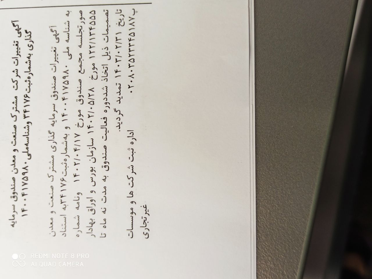 آگهی تغییرات شرکت مشترک صنعت ومعدن صندوق سرمایه گذاری صنعت ومعدن