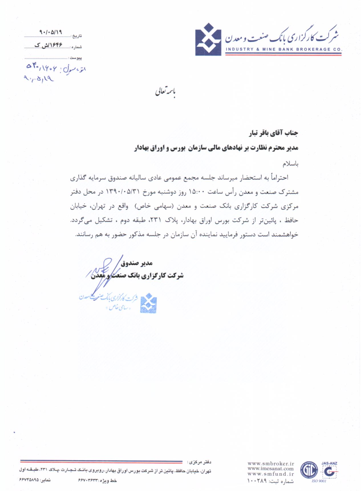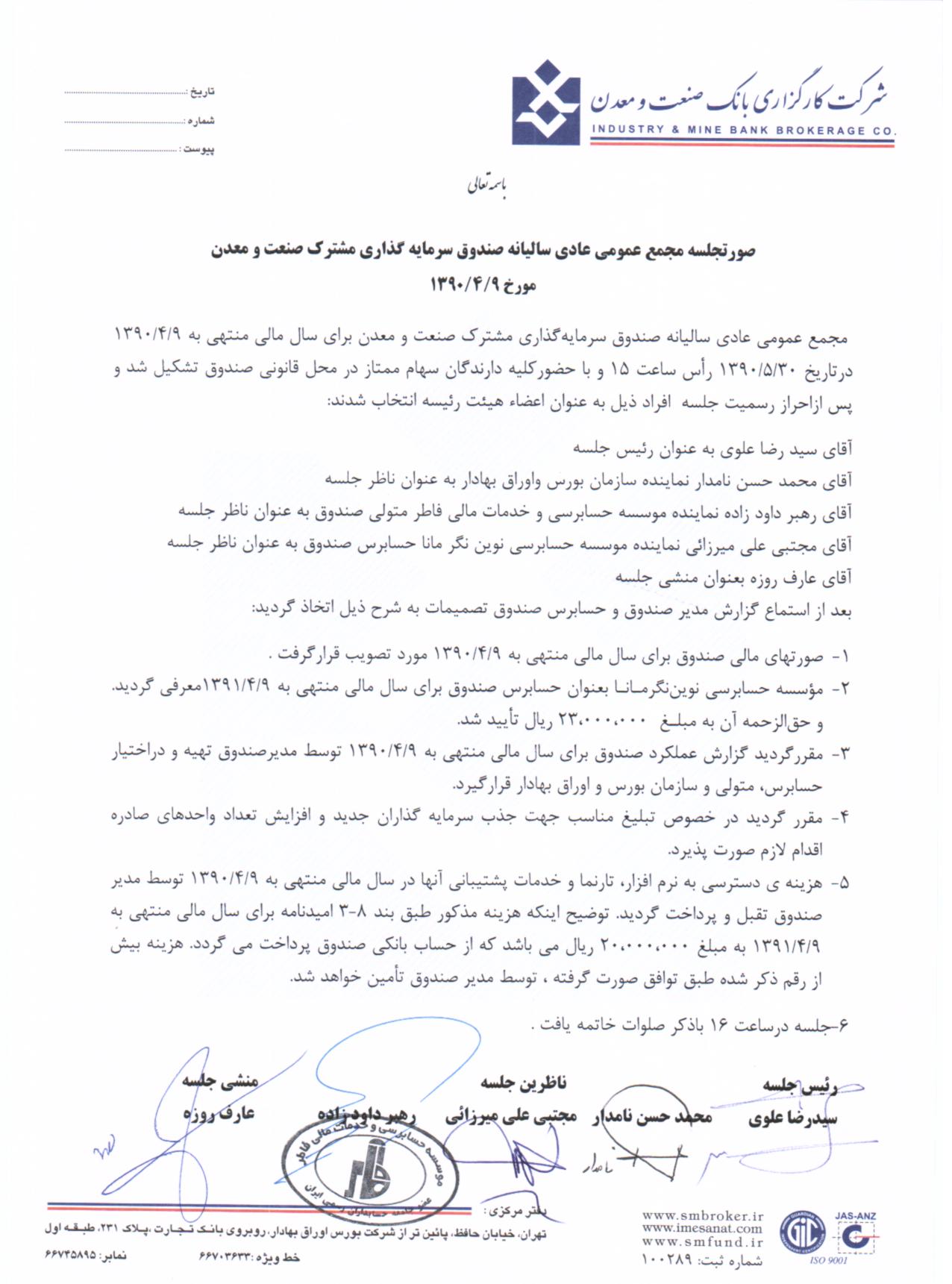 برگزاری مجمع عمومی عادی سالیانه صندوق سرمایهگذاری مشترک صنعت و معدن در تاریخ ۲۳/۶/۱۳۸۹